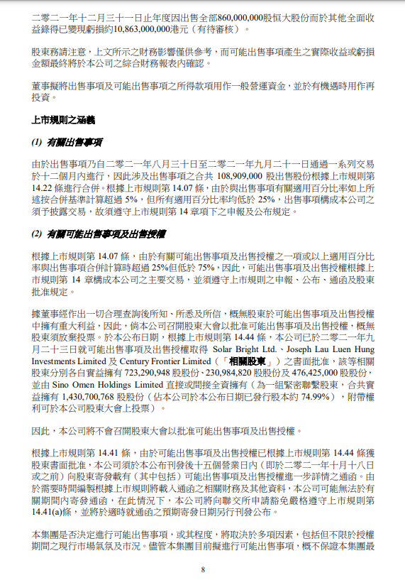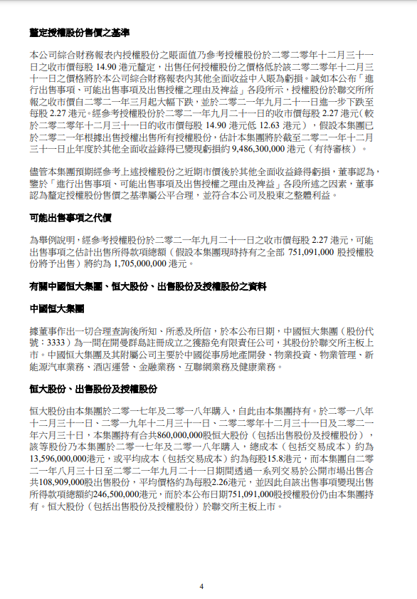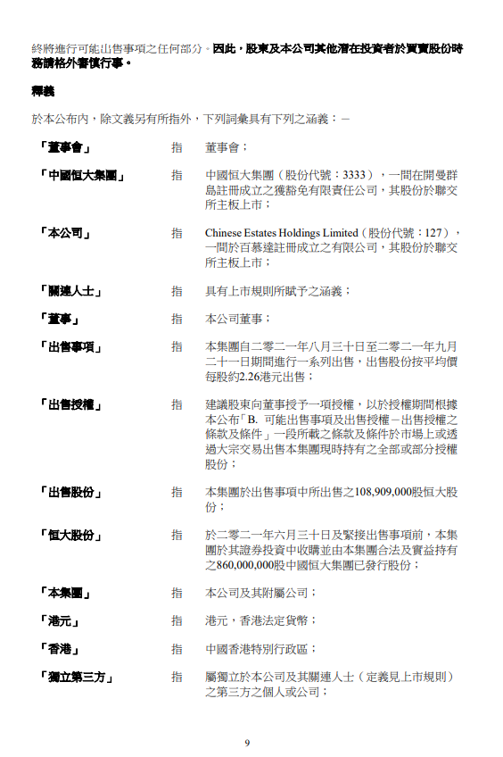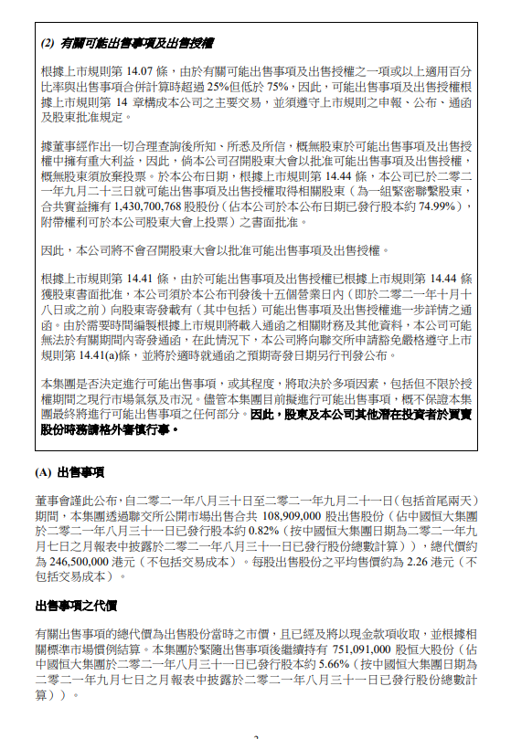 凤凰网财经讯 9月23日,华人置业在港交所公告,8月30日至9月21日期间,透过联交所公开市场出售合共中国恒大集团1.09亿股股份,总代价约为2.465亿港元;可能会出售所持余下全部中国恒大股份,预计将录得亏损95亿港元。