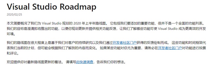 并称,如果用户认为有一些功能很重要的话,就可以在开发者社区门户网站中进行投票和评论。同时,其也提供了一个快速调查表,以收集用户针对最新路线图的看法。