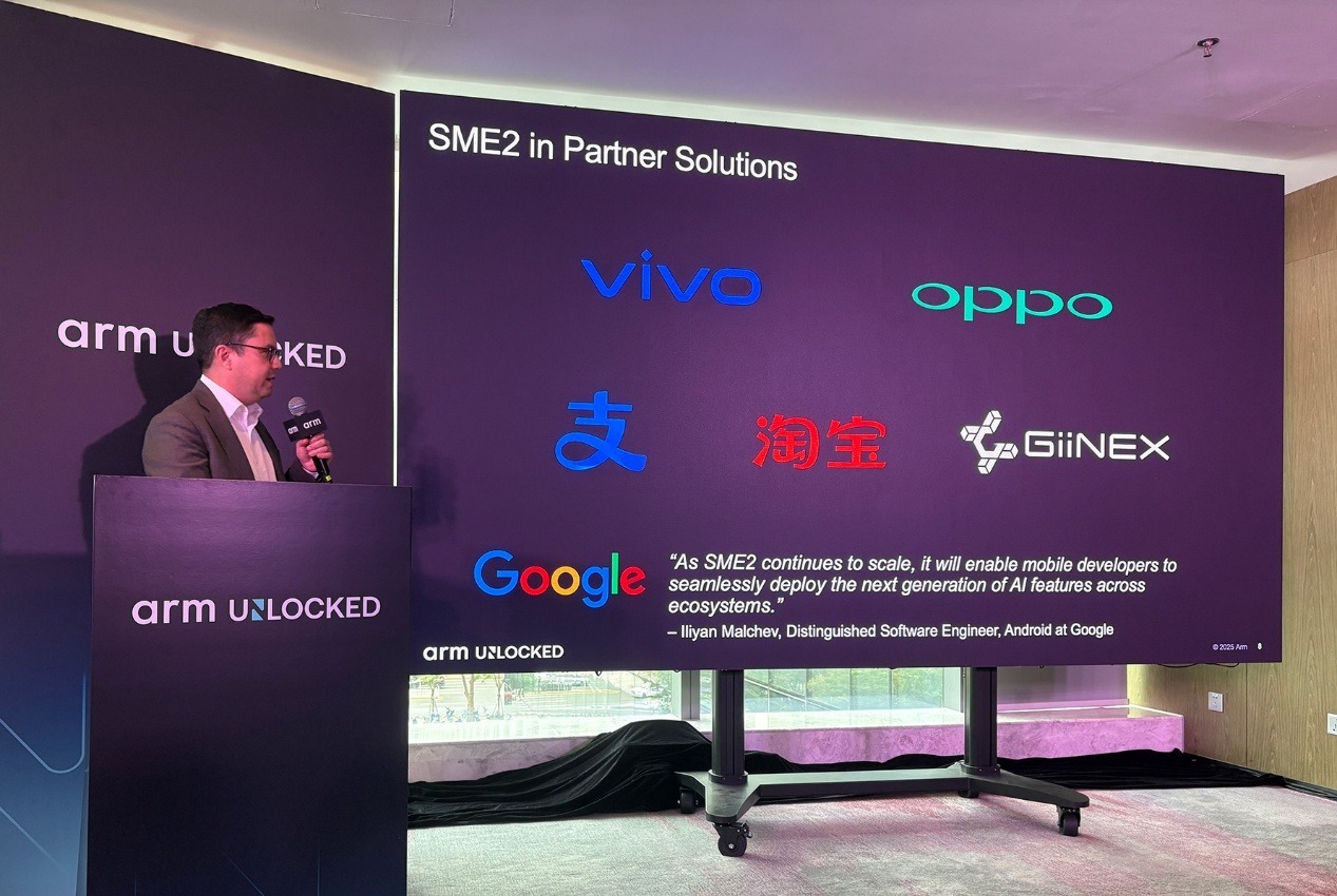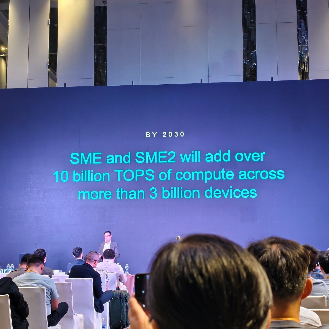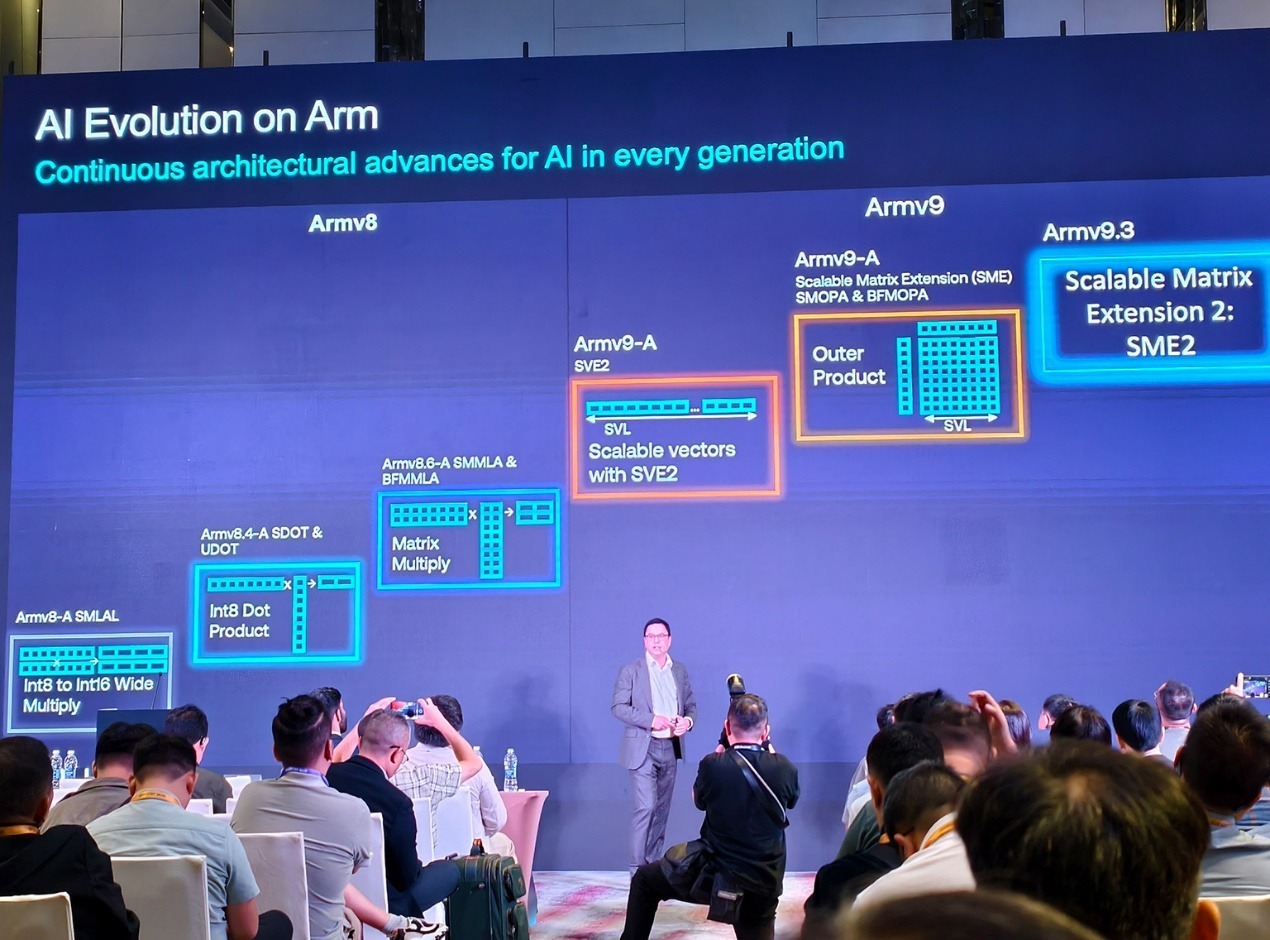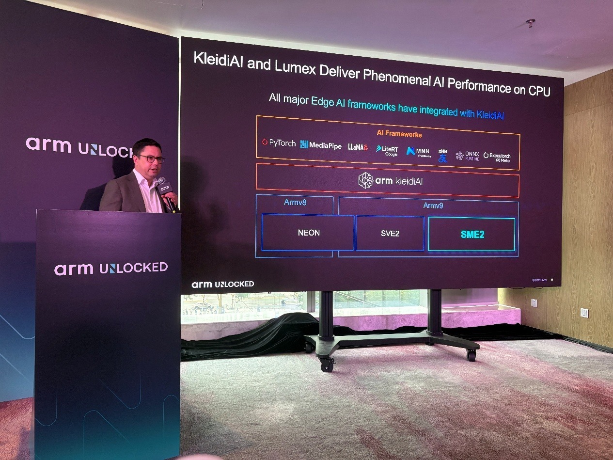 在本次深圳峰会上,Arm终端事业部产品管理副总裁James McNiven还为我们详细介绍了SME2技术的优势所在。他指出,SME2是Arm应对端侧AI爆发的关键技术,它标志着端侧AI开发正迈入一个对开发者更为友好的新时代。