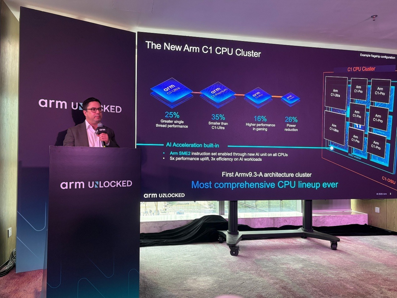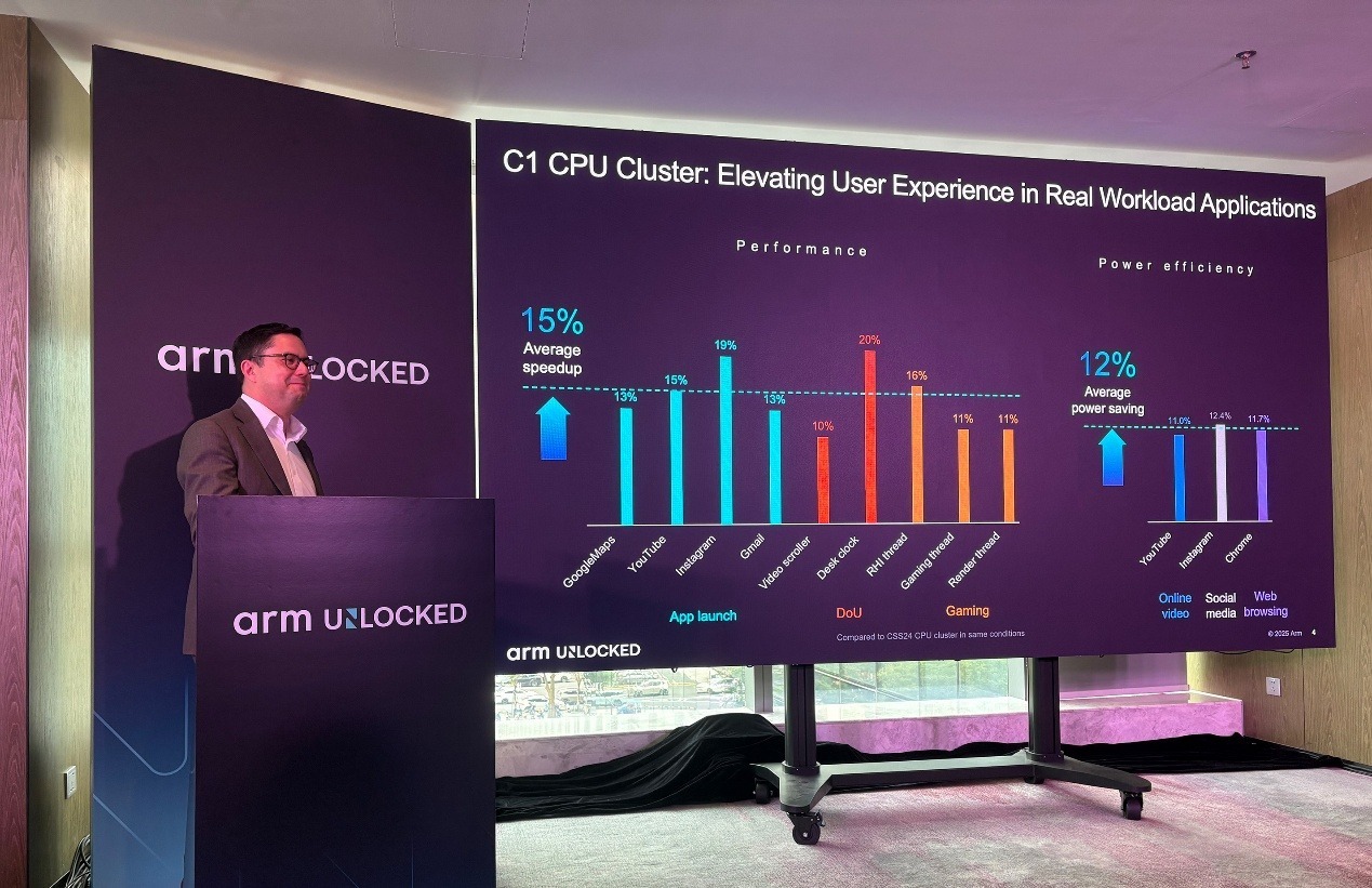 因此从Lumex 平台开始,Arm引入了新的产品命名体系。在这个新命名体系下,Lumex平台里面的CPU系列会以Arm C1-Ultra、C1-Premium、C1-Pro以及C1-Nano等名称出现。James McNiven也在演讲中表示,“如此命名也是为了让整个行业和我们的合作伙伴能够更加一目了然地理解产品定位。”
