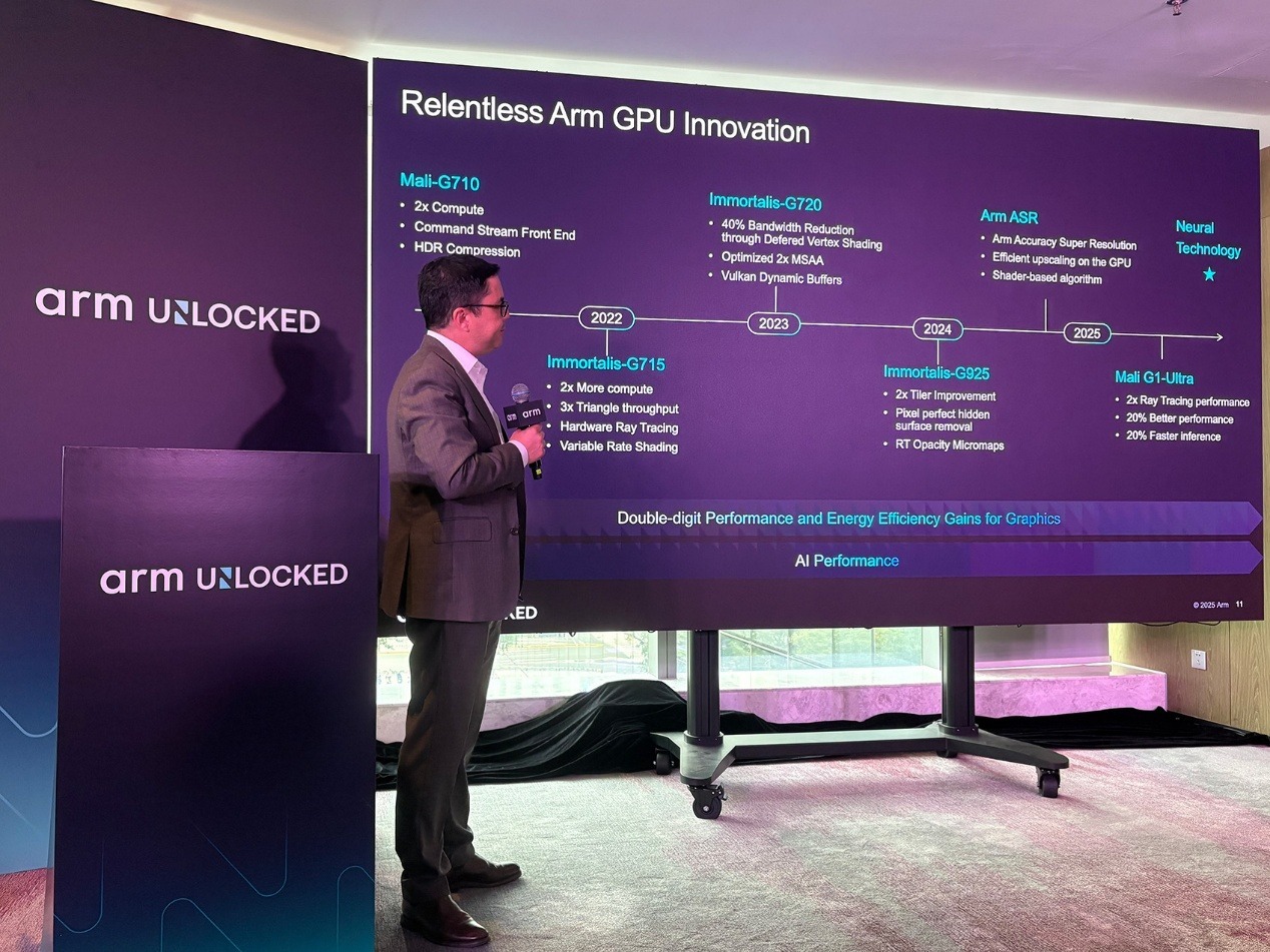 与此对应,GPU产品线也进行了统一。例如,过去代表顶尖性能的“Immortalis”品牌,现在被统一纳入Lumex体系下的Mali品牌,如最新发布的Mali G1-Ultra。