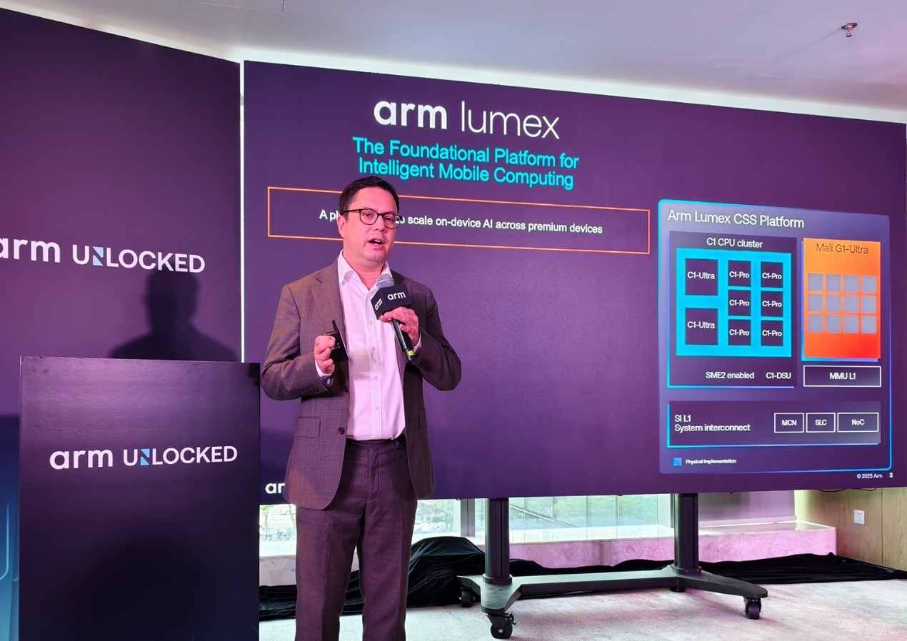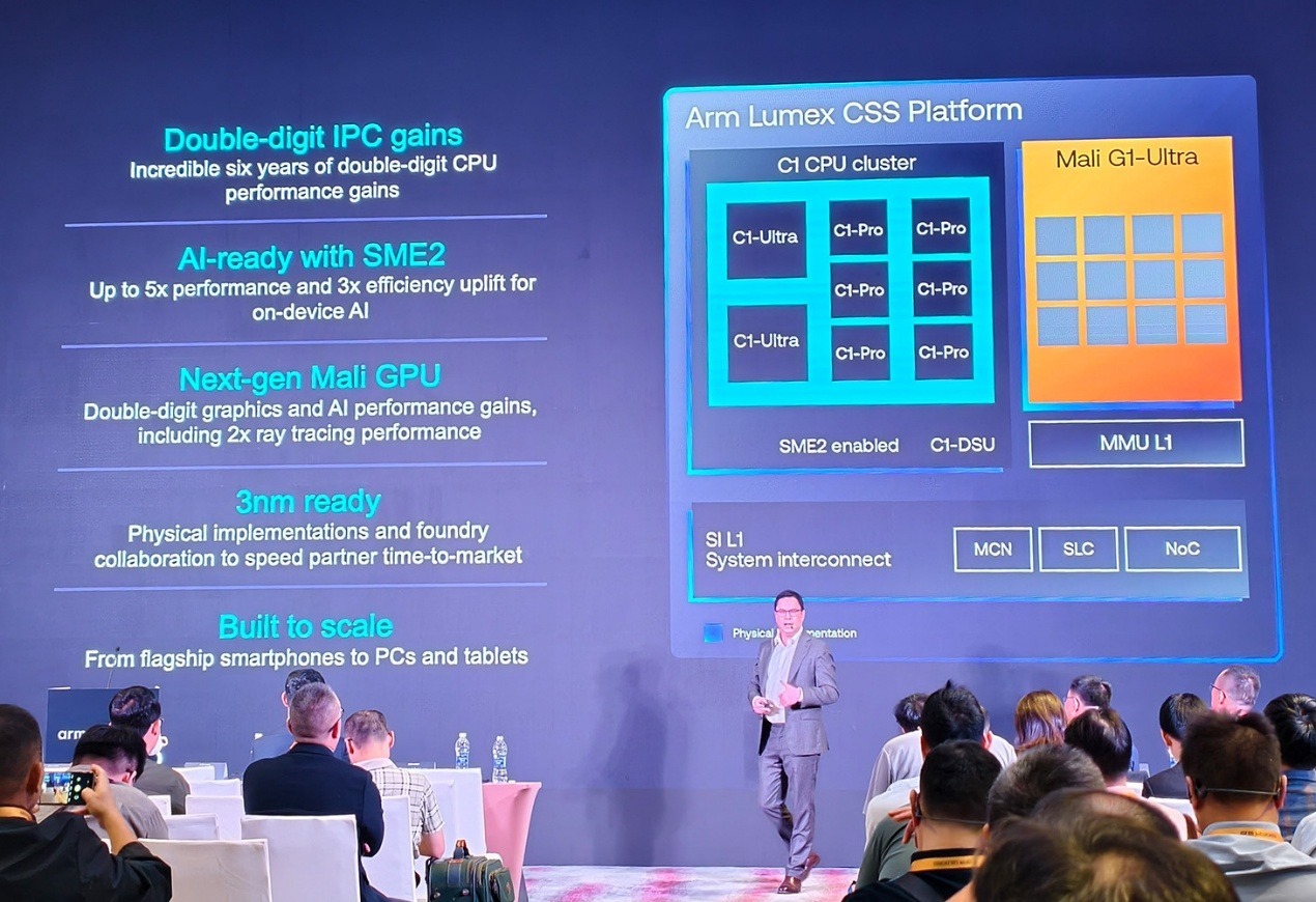 太平洋科技此次也受邀来到活动现场,为大家带来现场、立体和一手报道。本次峰会共设有四大主题分论坛。在消费电子设备技术专场演讲上,Arm介绍了近期宣布的重磅消息:其面向终端市场的CPU将告别沿用已久的“Cortex”命名体系,转而启用全新的命名规则,并隆重推出了专为智能终端打造的“Lumex CSS”平台。