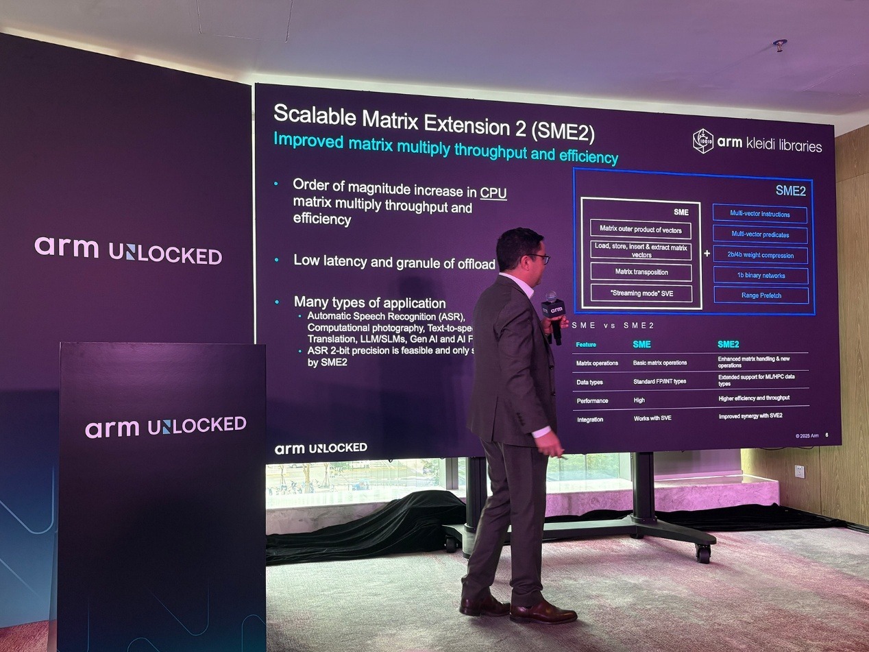 James McNiven的介绍道“SME2 是专为加速矩阵运算和相关负载而设计,非常适合移动设备等对功耗和响应速度要求极高的场景。它能够实现高效的模型压缩与推理,相比 SME1,在性能与能效上都有显著提升。更为关键的是,SME2 能够在低延迟、高实时性的应用场景中展现独特优势。本质上,它使端侧 AI 推理可以直接在 CPU 上完成,从而大幅减少数据在 CPU、NPU 或 GPU 之间的传输延迟。以语音识别为例,这类任务对响应速度要求极高、数据量相对较小,在 CPU 上直接执行不仅能显著提升流畅度,也能更好地发挥 SME2 的实时计算优势。”