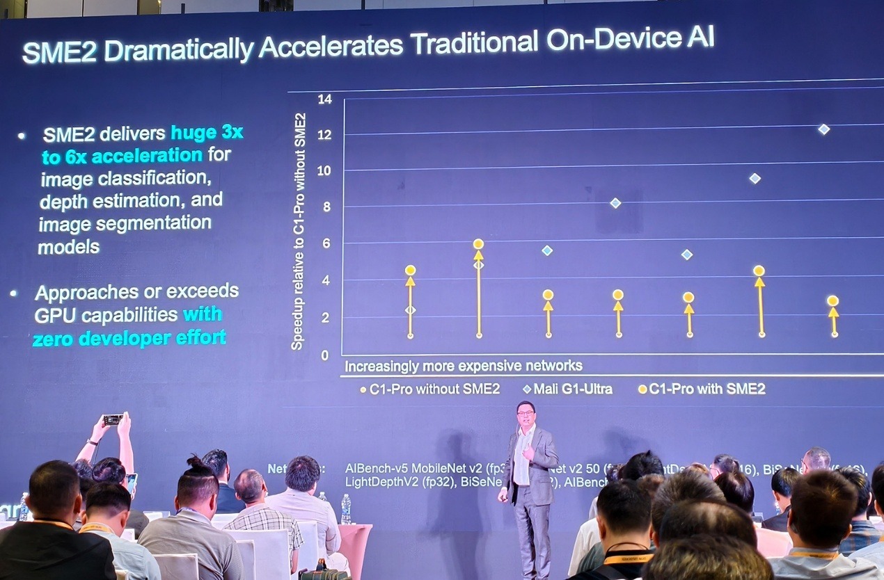 我们本次参与的消费电子设备技术专场主要聚焦于Lumex CSS平台,它致力于驱动消费电子设备“更智能、更高效、更个性化”的升级。它集成了搭载SME2技术的最高性能Arm CPU、Mali GPU及关键系统IP。Arm强调,这一平台化方案,不仅能助力生态伙伴更快地将AI设备推向市场,还将为消费者带来前所未有的丰富体验,包括桌面级的移动游戏、实时多语言翻译、更智能的个人助手以及高度个性化的应用。