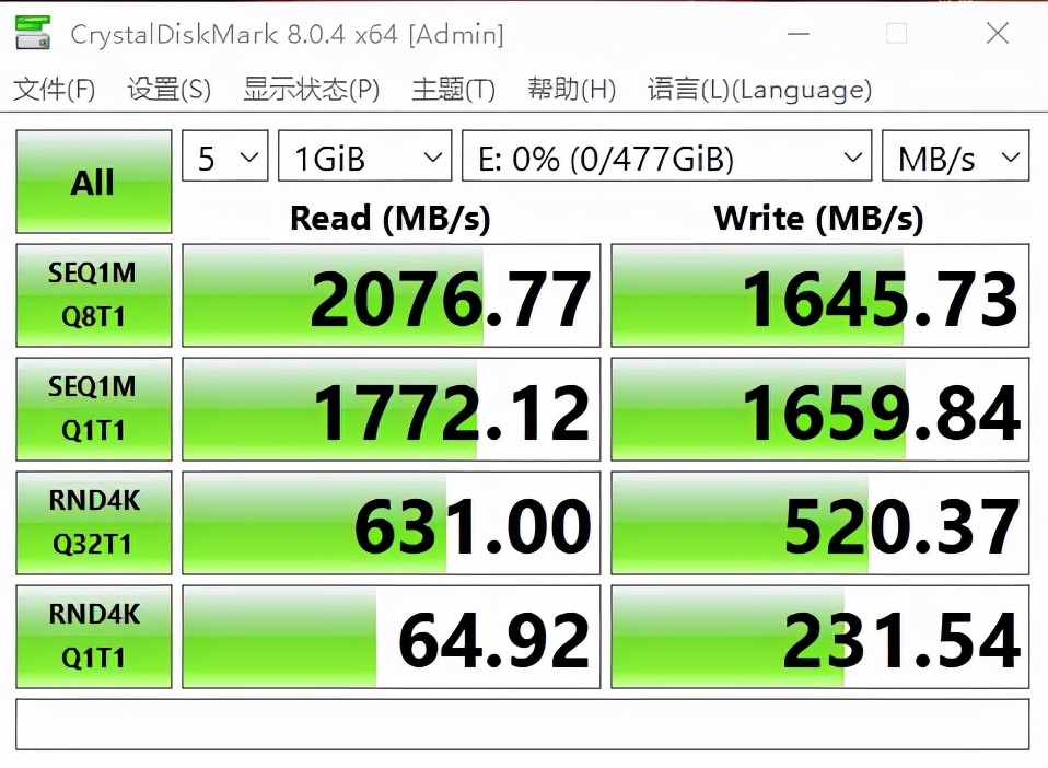 接着使用CrystalDiskMark进行读写测试,可以看到台电幻影NP900固态硬盘的连续读取速度为2076MB/s,写入速度为1645MB/s。顺便说一句,不同的硬件环境,也会对固态硬盘的读写速度造成一定的影响,这些读写测试结果仅供参考。