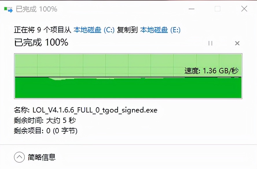 除了通过软件进行读写测试,还可以通过实际的文件集合进行复制来测试文件的读写性能。通过使用9个文件组成的11GB文件夹来进行测试,可以看到其整体的写入速度在1.36GB/s,这个写入速度还是非常节省时间的。