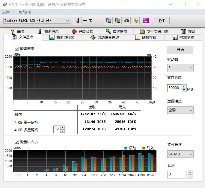HD Tune Pro可以通过自定义文件长度和数据模式来测试缓外读写速度,通过选择50GB文件长度进行测试,台电幻影NP900固态硬盘读取速度平均在1742MB/s左右,写入速度在1545MB/s,整体曲线波动较小,这个结果还是比较让人满意的。