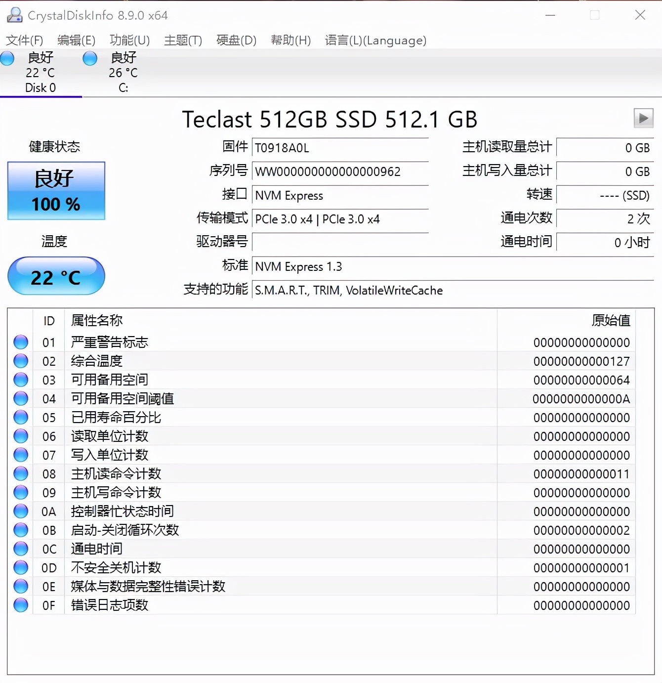 新装的固态硬盘一般都没有分区,用户可以根据需要对其进行分区操作。通过CrystalDiskInfo可以查看硬盘的相关参数信息,验证硬盘是否为新的。通过测试可以看到其写入、读取总量以及通电时间均为0,通电次数仅为2次,健康状态100%。