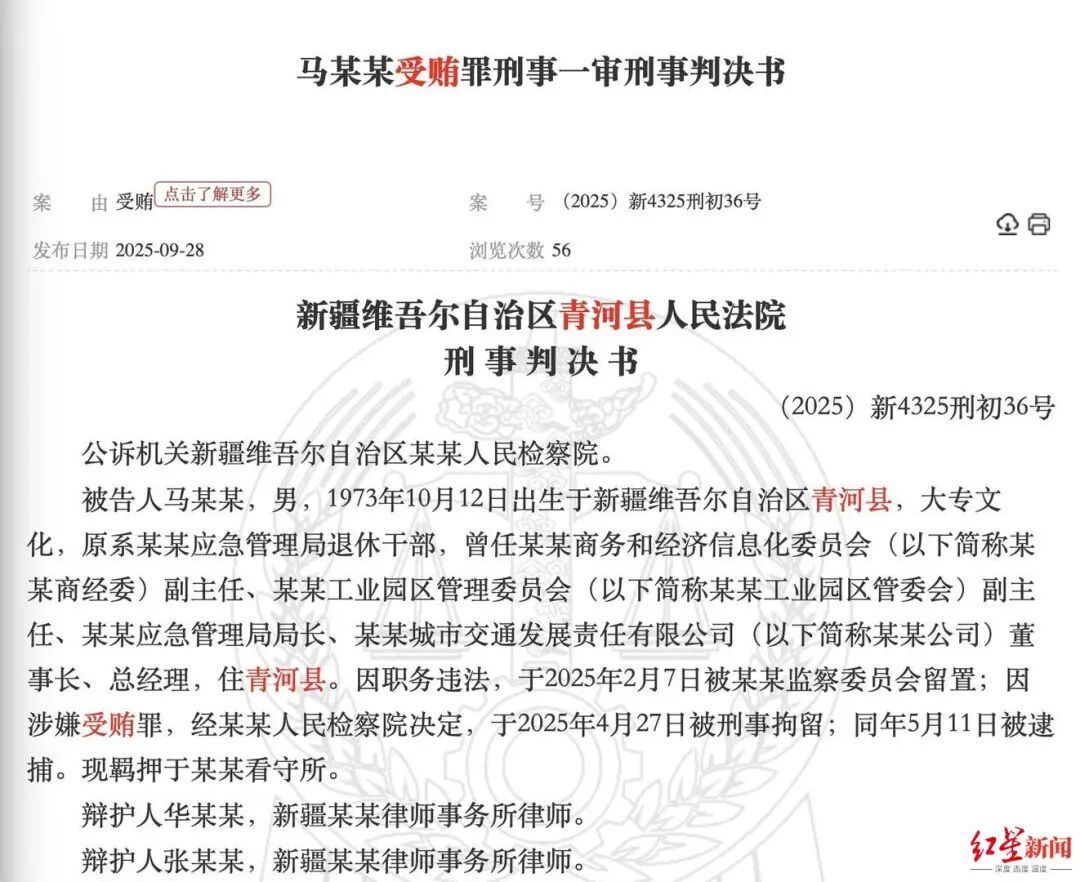 今年8月26日,新疆维吾尔自治区青河县人民法院一审判决被告人马某某犯受贿罪,判处有期徒刑十年,并处罚金人民币五十万元;依法追缴被告人马某某违法所得24.52133万元,已追缴并扣押的违法所得161.90867万元由扣押机关上缴国库。