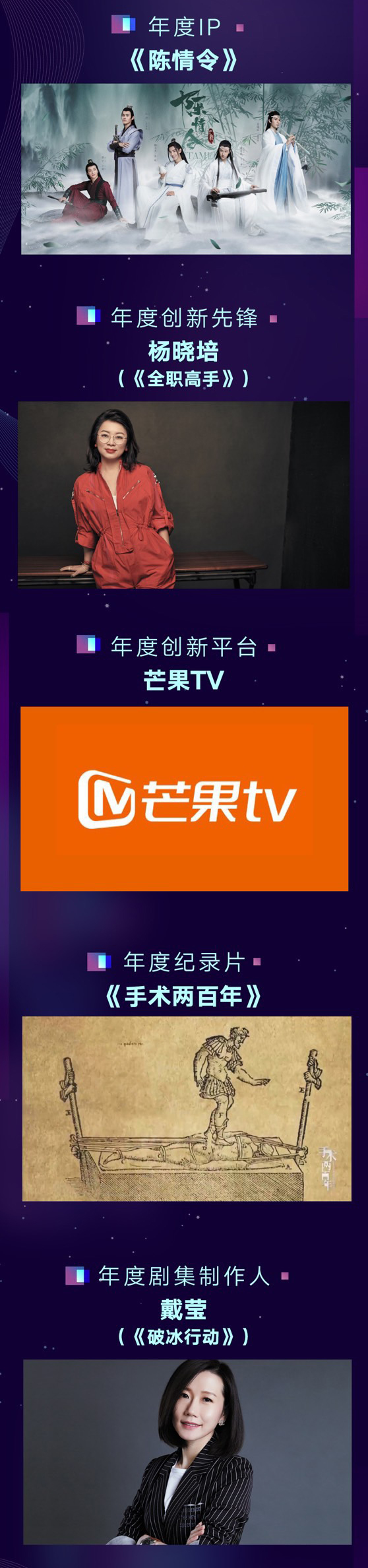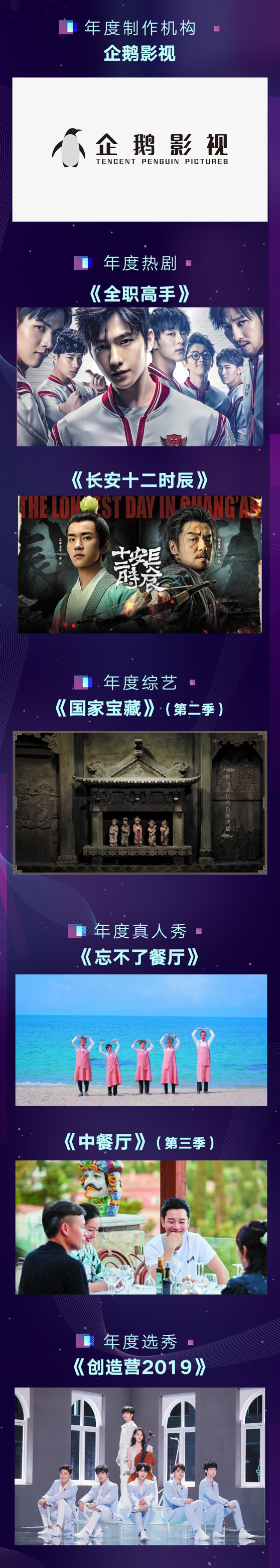 《全职高手》与《长安十二时辰》共同获得“年度热剧”;《忘不了餐厅》与《中餐厅》(第三季)共同获得“年度真人秀”。《创造营2019》获得“年度选秀”,展示了选秀节目经过15年沉淀后新的思考和定向;《陈情令》摘得“年度IP”,它助推主演肖战、王一博成为顶级流量。