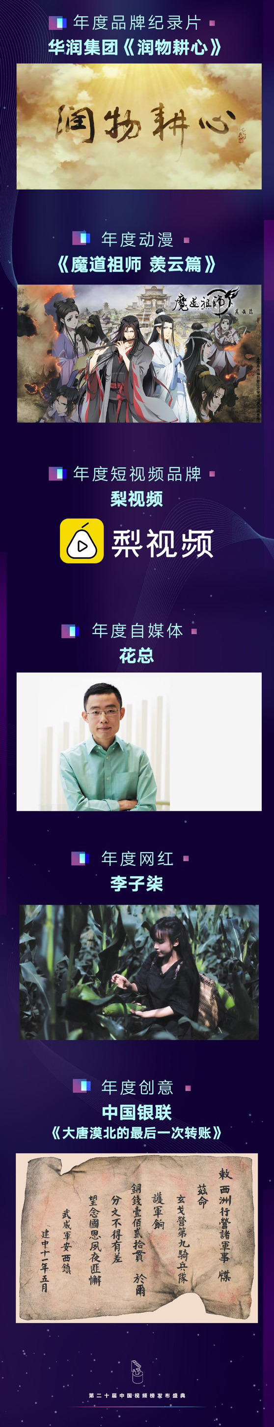 《润物耕心》讲述了80年的华润集团历史,获评“年度品牌纪录片”;《魔道祖师 羡云篇》融入国风美学的深邃和多彩,被誉为国漫崛起之作,获评“年度动漫”。中国银联出品的《大唐漠北的最后一次转账》,是2019年广告界的惊喜,提升了品牌广告的格调和格局,获评“年度创意”。