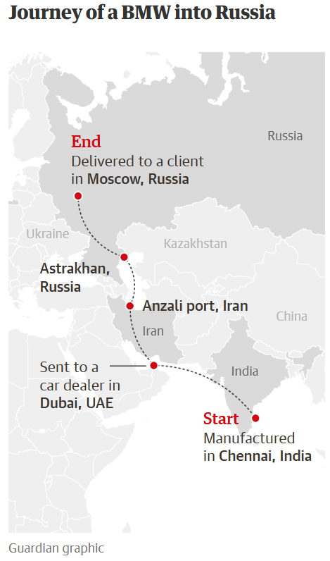 讽刺的是,在今天,这不是为了军备竞赛,而是为了冲破人为制造的障碍——莫斯科人想买一辆BMW,它得先在印度组装,由迪拜的经销商购入,转卖到亚美尼亚,再避开那些为制裁俄罗斯而提高关税的国家,最终运至莫斯科,走出了一条“新丝绸之路”。