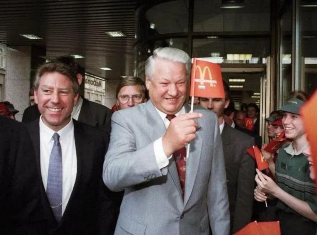 叶利钦拿着麦当劳小旗走进俄罗斯第二家麦当劳