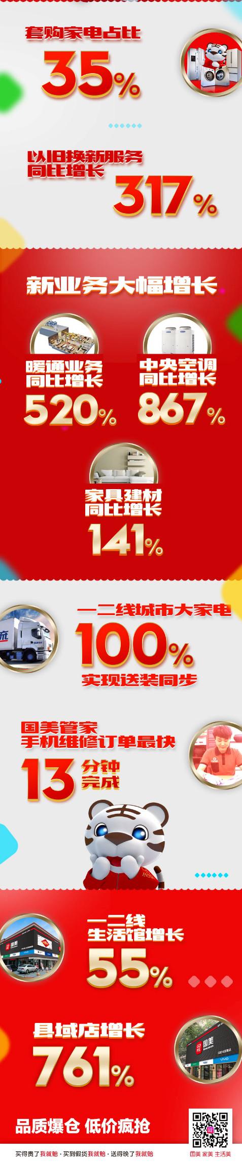 此外,双十一期间国美联合众多家电一线大牌爆款5折起抢购,更有大额满减优惠券、套购买4免1、以旧换新等活动加持,双十一当天,国美套购家电占比高达35%,以旧换新服务同比增长317%。同时,国美在家居家装及暖通、中央空调等新业务方面继续扩大市场份额,截止到11日24时,暖通业务同比增长520%,中央空调同比增长867%,家具建材同比增长141%。此外,新市场方面也取得了不错的战绩,一二线城市生活馆销售增长55%,县域店销售增长761%。