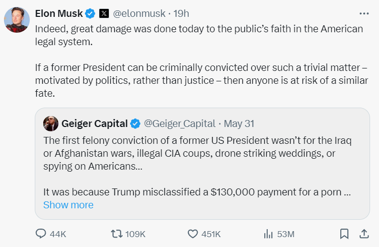 特斯拉CEO马斯克也在X平台上发布多条帖子对特朗普裁决一事进行评论。他认为,这是出于政治目的在滥用法律,极大地损害了公众对美国司法系统的信任。“如果一位前总统因为这样一件微不足道的事情而被定罪——出于政治动机,而不是为了正义——那么任何人都有可能遭遇同样的命运。”