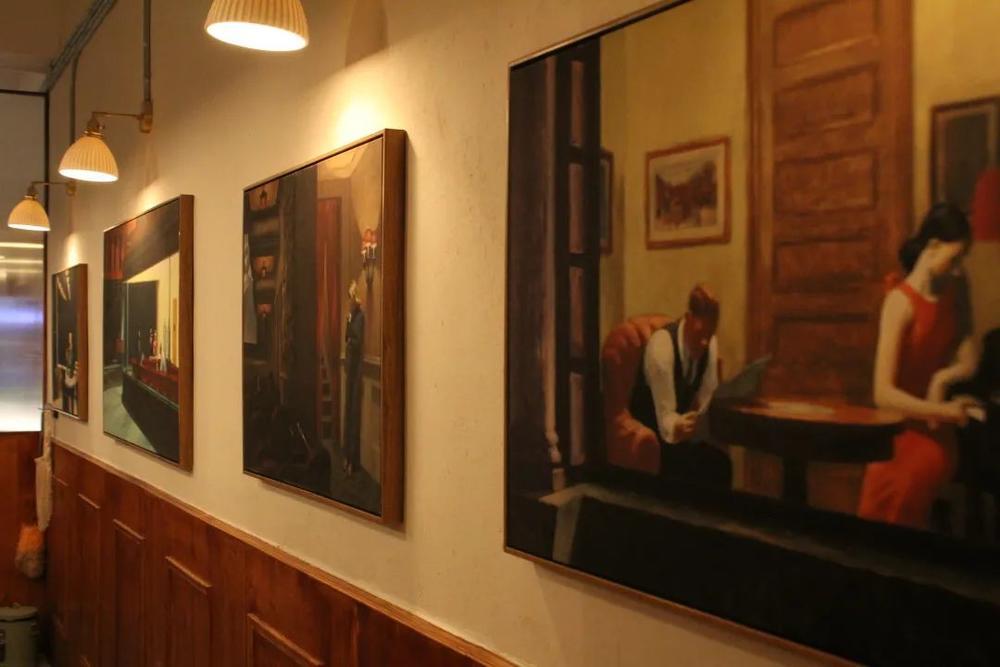 这家店自成一体的装修风格即带来了温馨感,又在细节上透露着用心。一排沙发座,走廊空间巧妙地布置成展示墙。老板用《Nighthawks》《Room in New York》以及另一处的《HOPPER》毫不保留地表达着自己对爱德华·霍普的喜爱。