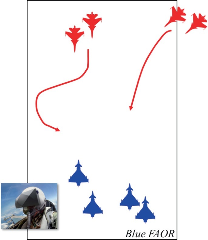 一个标准的4机FAOR示意,在这个空域内,蓝方面对红方沿着边界展开的主佯配合攻势,有着充足的应对空间