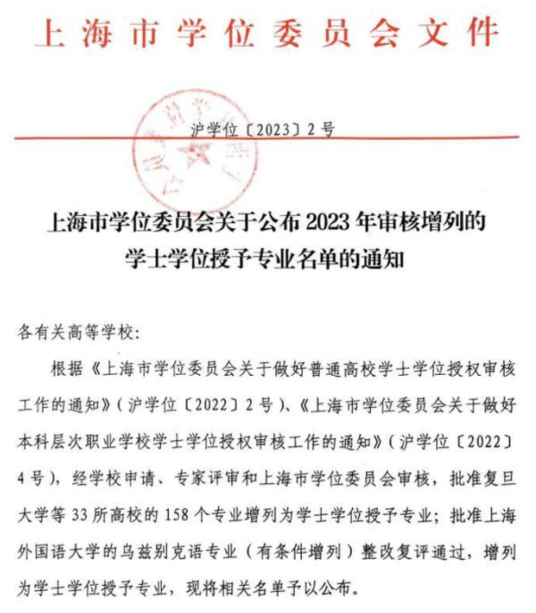 据新闻晨报报道,上海市学位委员会日前公布了2023年增列学士学位授予专业名单