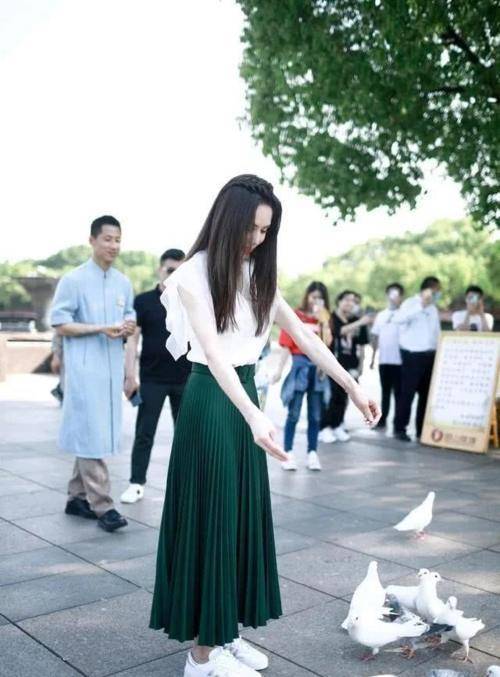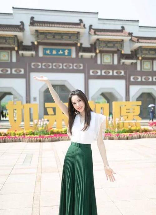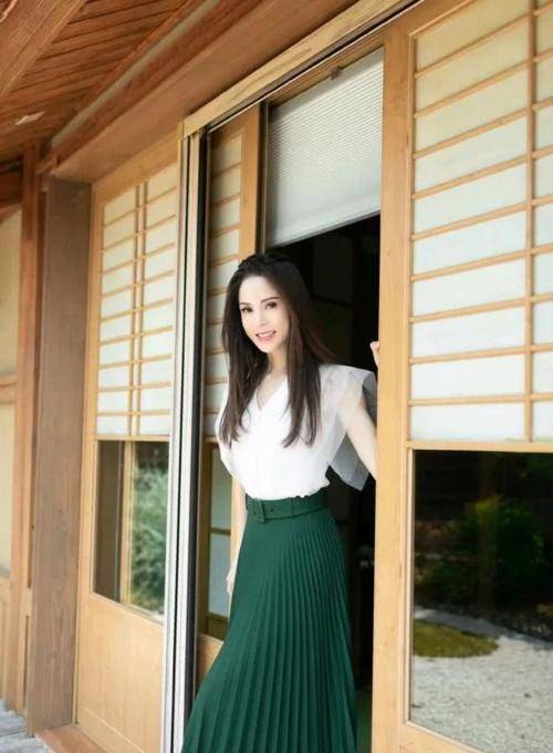 再加上袖口设计很宽大,还采用了两层的设计风格,穿在李若彤身上显得很有层次感,而且雪纺的面料还带有透视装的设计,穿在李若彤身上,给人一种温温柔柔的感觉,并且白色和墨绿色,形成很明显的色差,李若彤还处理得很完美,她把上衣的衣摆塞进了裙装里,呈现出来的效果显高又显瘦。