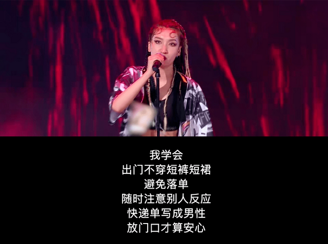 前面张晨蕾唱的是对成长环境中“ 重男轻女”腐朽观念的反抗,芮雪的《错了吗》则是讨论当代 女性穿衣自由。