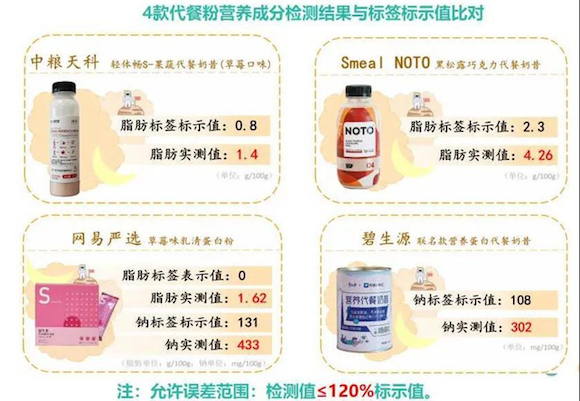 深圳市消费者委员会日前发布了关于《2020年轻食代餐粉比较试验报告》,在对选取的共10款(5款国产、5款进口)轻食代餐粉商品开展比较试验后发现,中粮天科轻体畅S-果蔬高蛋白代餐奶昔(草莓口味)、Smeal NOTO黑松露巧克力代餐奶昔、网易严选蕴莓味乳清蛋白粉(国体饮料)脂肪实测值超出产品标签标示值允许范围;碧生源×有道云笔记联名款营养代餐奶昔固体饮料(巧克力味)、网易严选草莓味乳清蛋白粉(国体饮料)钠实测值超出产品标签标示值允许范围。(界面新闻)