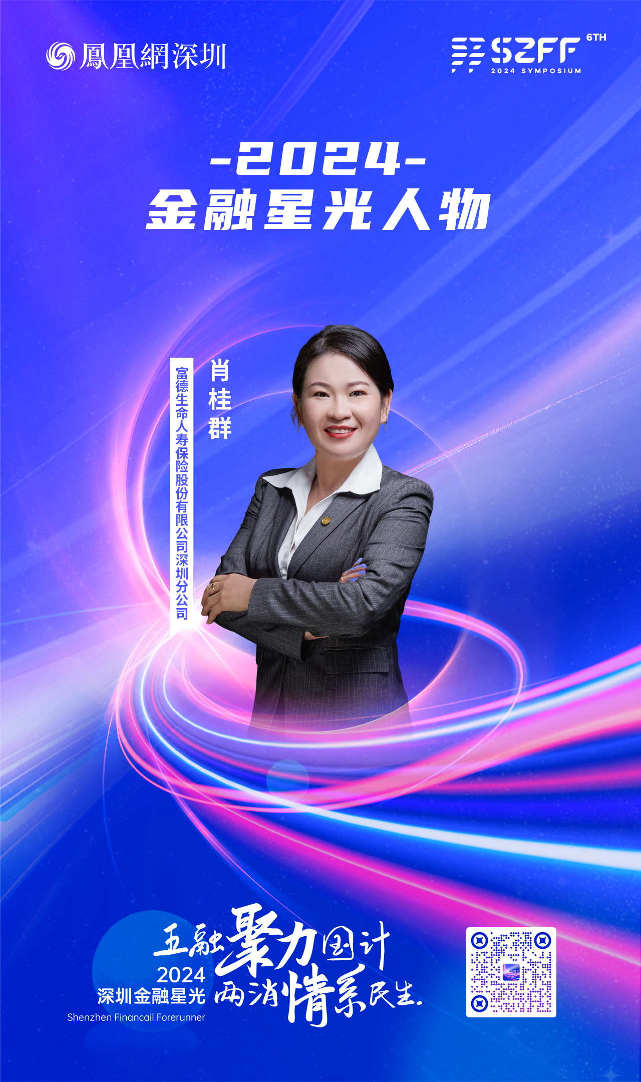 肖桂群,富德生命人寿保险股份有限公司深圳分公司资深精英经理,深耕保险行业十四年,以专业的服务能力和始终如一的责任心,用实际行动诠释了"保险是爱与责任的体现"的理念,收获众多客户的信赖与好评。