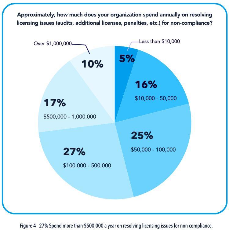 调查显示,有 54% 的受访者表示,他们所在的组织每年在解决许可不合规问题上的开销超过 10 万美元;其中 27% 更是每年花费超过 50 万美元。这也进一步说明,合规问题绝不是一个可以“先放一放”的小麻烦。