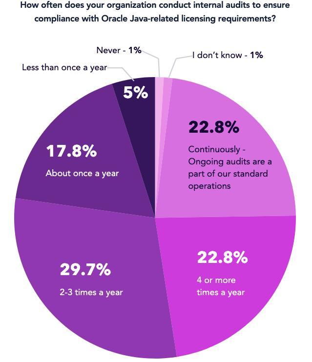 不过,即便已经转向开源,组织对 Oracle Java 的使用仍需保持高度敏感。毕竟,哪怕是一个未被察觉的 Java 实例,也可能引发一张不小的账单。调查显示,超过 75% 的受访者每年至少经历两次 Oracle Java 的合规检查,甚至有接近四分之一的企业常年处于审计状态之中。