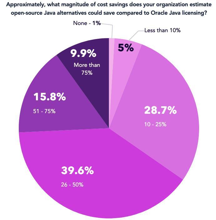至于迁移的“性价比”,数据几乎是一边倒的倾斜。在被问及迁移到开源 Java 方案后的成本变化时,超过三分之二的受访者估计,他们至少能节省 40% 的 Java 许可费用,只有 1% 的人认为迁移不会带来节省。这进一步突出了开源 Java(如 OpenJDK)在当前市场环境下的吸引力,也解释了为何越来越多企业愿意告别 Oracle 的授权体系。