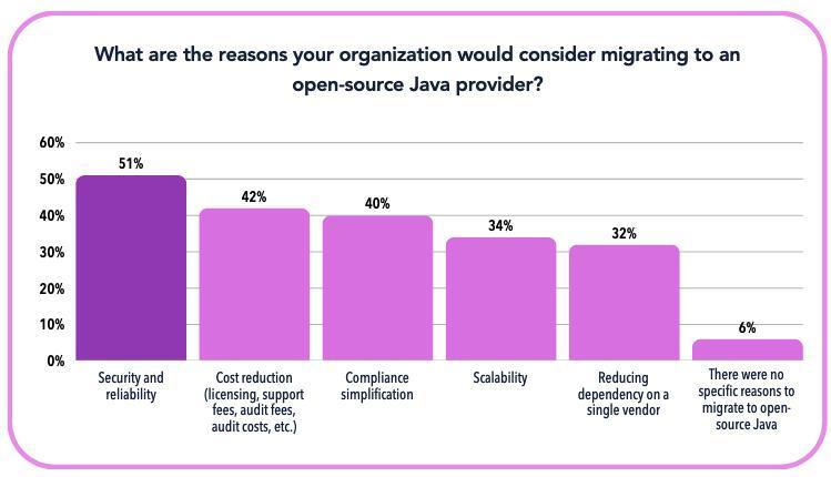 在公司弃用 Oracle Java 而选择开源软件时,有 51% 的受访者将“安全与可靠性”列为首要考虑因素。其次 42% 的人是因为这样可以有效降低成本才选择了开源软件。