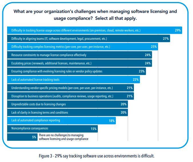 之所以会有这些问题产生,29% 的受访者透露,是因为软件开发环境日趋复杂,根本无法跨本地、云、远程等环境有效追踪许可证使用情况。还有 25% 的人被复杂的计费模型(按核心、用户、实例等)搞晕。其次,不少企业内部缺乏自动化工具,只能靠人工维护,这一占比达到了 21%。