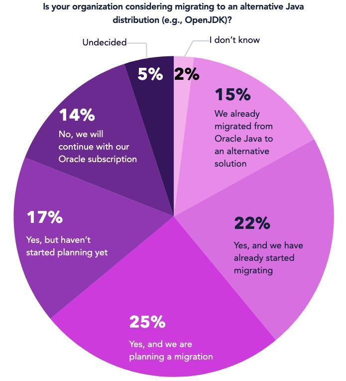 根据最新调查数据显示,鉴于开源软件的诸多优势,大规模的 Oracle Java 迁移正在进行中,79% 的受访者已经迁移到 OpenJDK 替代品或计划进行迁移。只有 14% 的受访者打算继续使用 Oracle Java 订阅。