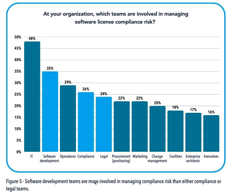 与此同时,不合规带来的影响不仅仅是金钱支出,整改过程中所消耗的大量时间也是一大负担,尤其会挤占开发团队本该用于核心业务的精力。在所有受影响的团队中,软件开发团队首当其冲,他们往往要深度参与管理应用堆栈中的合规风险,所承受的压力甚至超过了专职的合规或法务团队。
