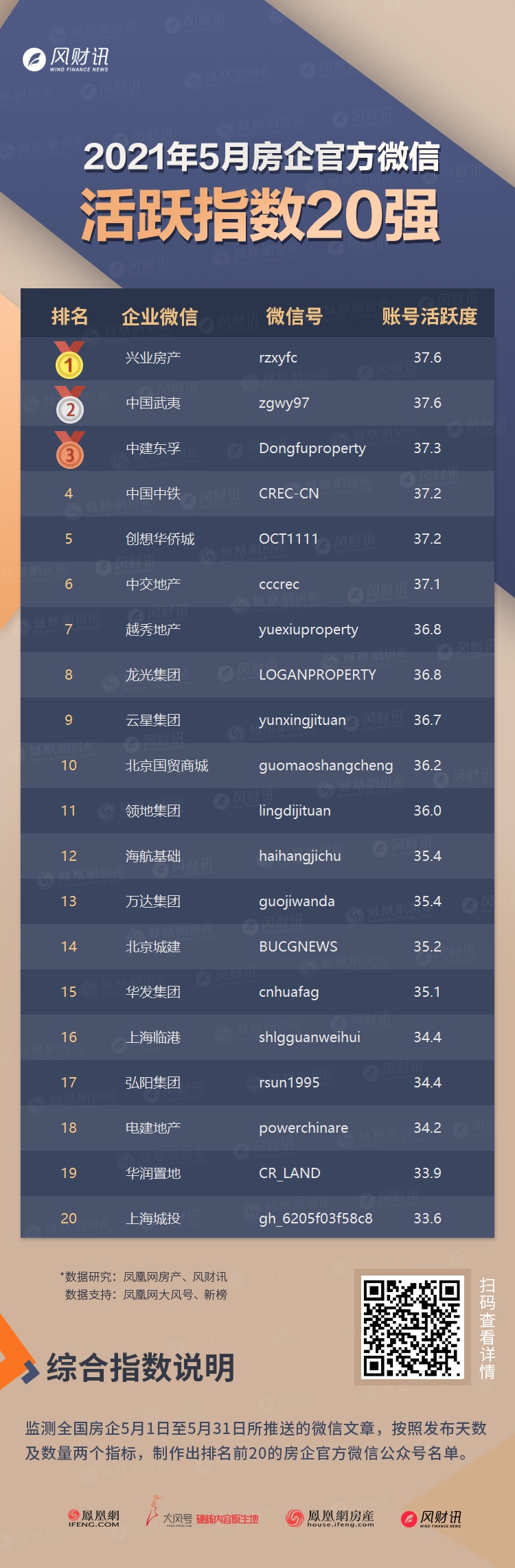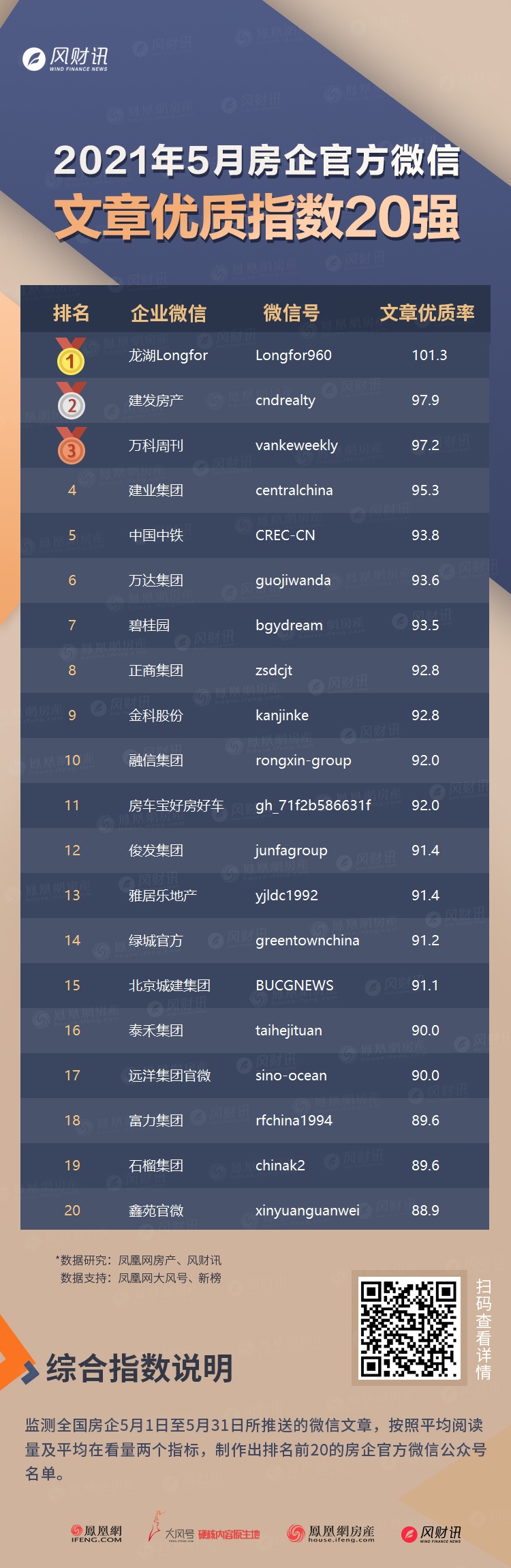 2021年6月1日,凤凰网大风号、凤凰网房产、风财讯联合发布2021年首期《房企官方微信影响力(REWI)百强榜》,榜单统计周期为5月1日至5月31日,以品牌房企5月的官方微信更新频率、阅读量、在看量、头条信息等数据为基础,分别赋值进行指数系统化、层次化计算,并进行点评和说明。