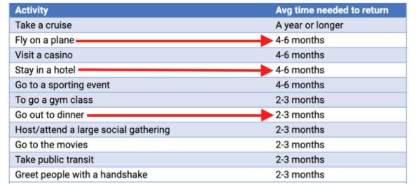 哈里斯民调(Harris Poll)4月上旬的统计发现,对于航空业而言,只有15%的美国人表示,将在疫情完全控制的一个月内重新搭乘飞机出行,16%的受访者选择三个月后再做决定,有接近一半的美国人(49%)将下一次航程安排在至少6个月以后。此外民众也推迟了诸如外出就餐、酒店住宿方面的计划。