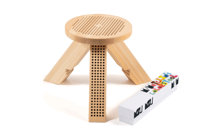 这款坐凳外观与棋盘游戏或拼图类似,使用者可以自行定义出自己专属的坐凳表面。火柴棍共有12种不同颜色可供选择,使用者可以轻松创造出多种不同设计。