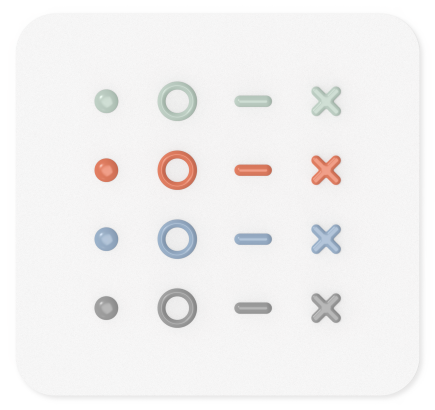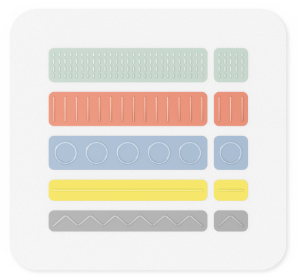 凹凸标签有四种形状和颜色,总共有 16 个标签。形状的变化是一个实心的点、一个开放的圆、一条破折线和一个 X 符号,每种形状的变化都有绿色、橙色、蓝色和灰色。
