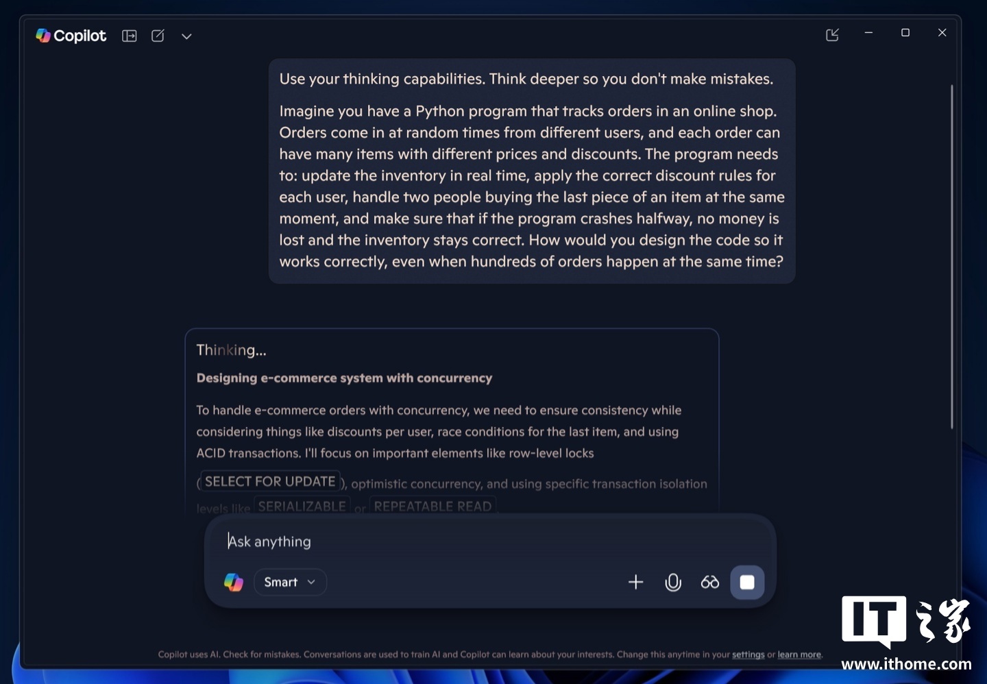 在 Copilot 的 GPT-5“思考”功能方面,其表现与 ChatGPT 的实现效果一样好。测试者曾向其提出 10 个关于 Python 的复杂问题,并附带不同案例,Copilot 每次都能准确回答,且在 10 次尝试中有三次请求了 GPT-5“思考”。尽管未出现使用限制耗尽的错误提示,但 Copilot 在一天内尝试五次后便停止请求 GPT-5“思考”。这一表现优于 ChatGPT 免费版,后者每天仅限一条“思考”消息。