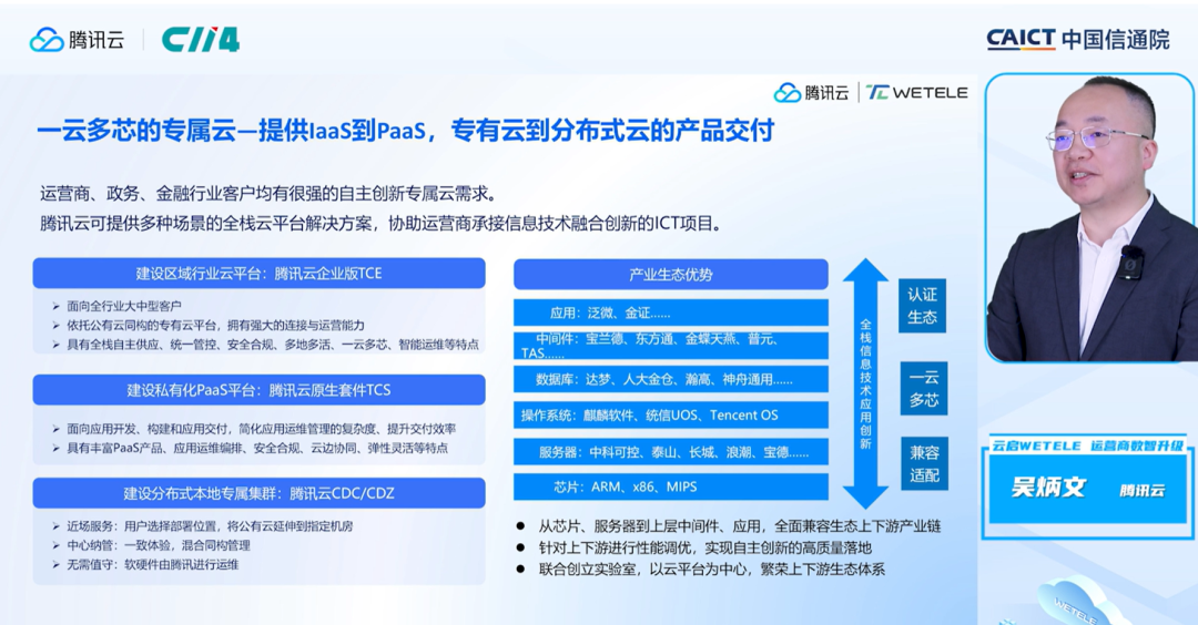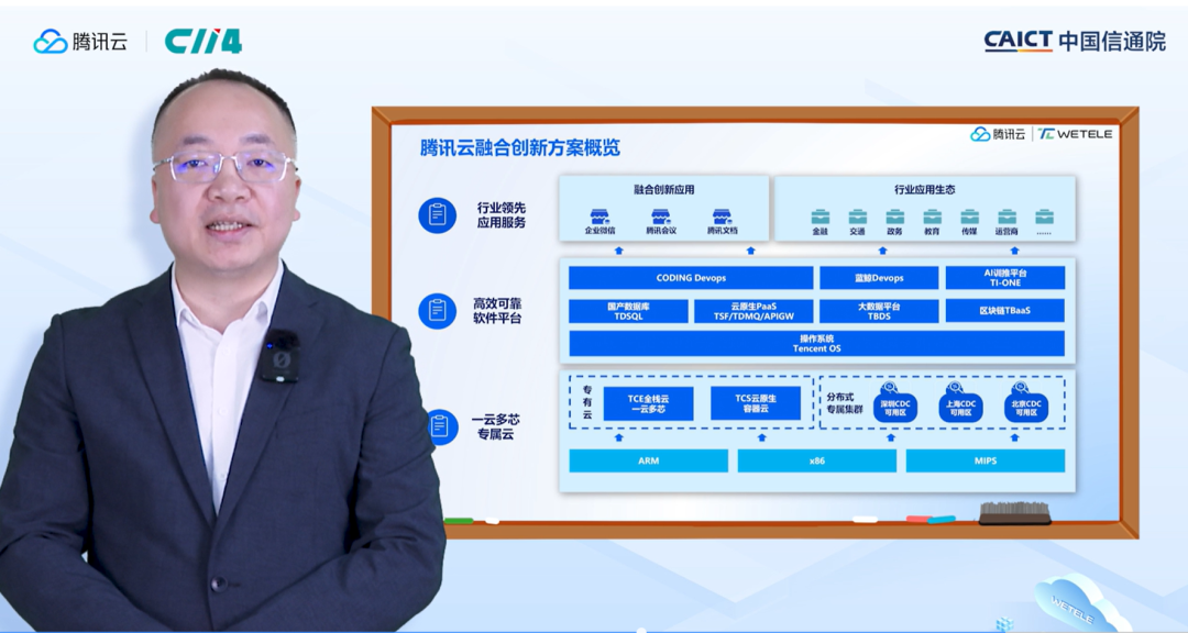 腾讯云融合创新方案在应用层面,拥有企业微信、腾讯会议、腾讯文档等国民级应用;在平台层面,打造了国产数据库TDSQL、云原生PaaS TSF/TDMQ/APIGW、大数据平台TBDS、AI训推平台TI-ONE等;在底层架构层面,具备一云多芯专属云。