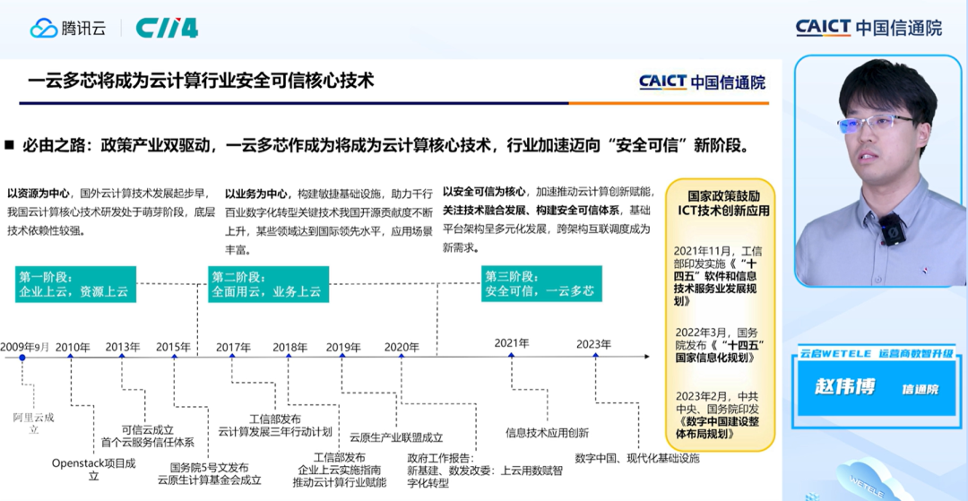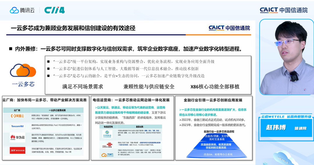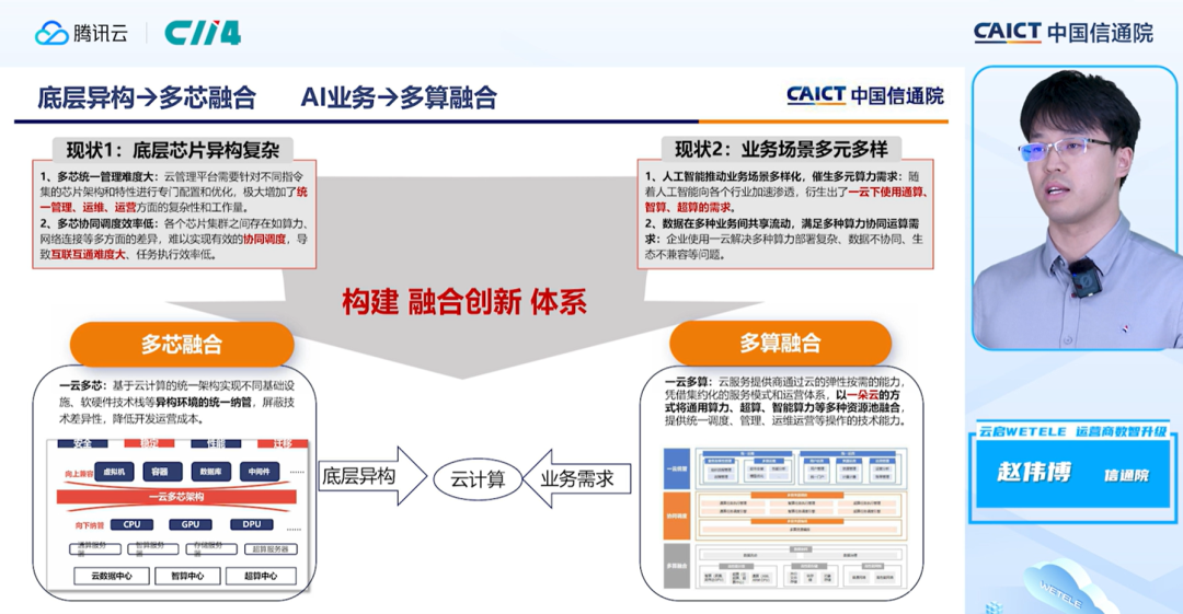 赵伟博以《多芯与多算融合创新推动云计算发展》为主题进行了分享。他认为,云计算面临底层芯片异构复杂、业务场景多元多样两大难题,需通过多芯融合、多算融合,构建云计算融合创新体系。