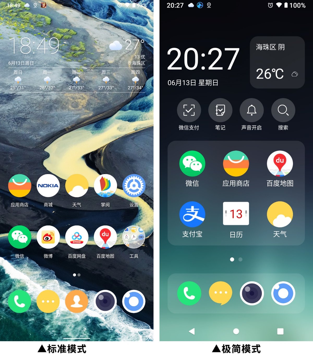 另外在极简模式下,Nokia C20 Plus 还会在主页面配备了四个可自定义的快捷功能,可以让用户快速开启移动支付页面、健康码、手电筒、收音机等页面,