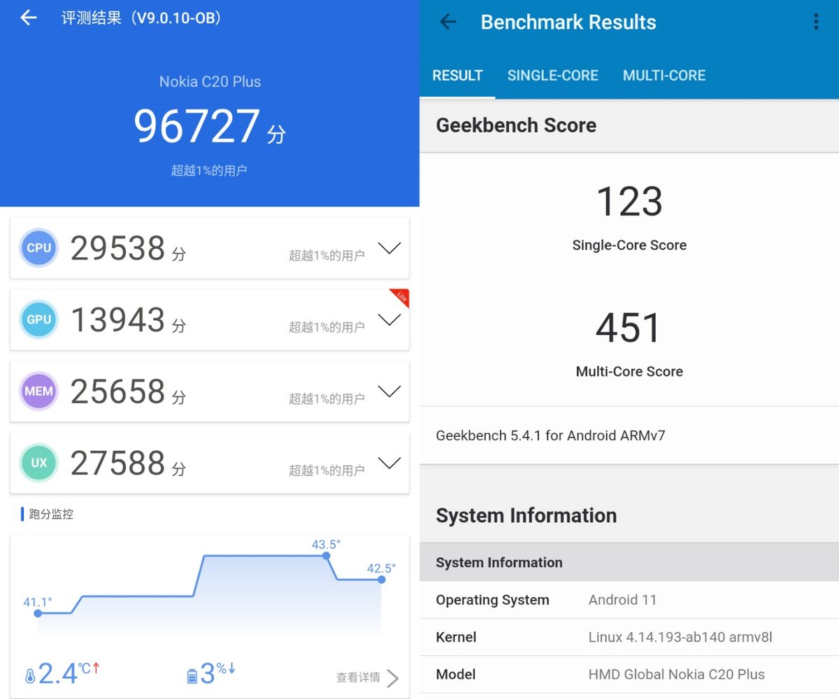 为了验证这颗芯片的性能去到什么水平,我拿 Nokia C20 Plus 在安兔兔和 GeekBench 平台上跑了把分,成绩并不理想。
