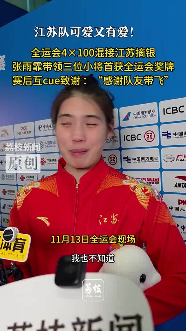 江苏队可爱又有爱!全运会4×100混接江苏摘银 张雨霏带领三位小将首获全运会奖牌赛后互cue致谢 :“感谢队友带飞” 11月13日,在十五运男女4×100米混合泳接力决赛中,张雨霏携手刘怡辰、董志豪