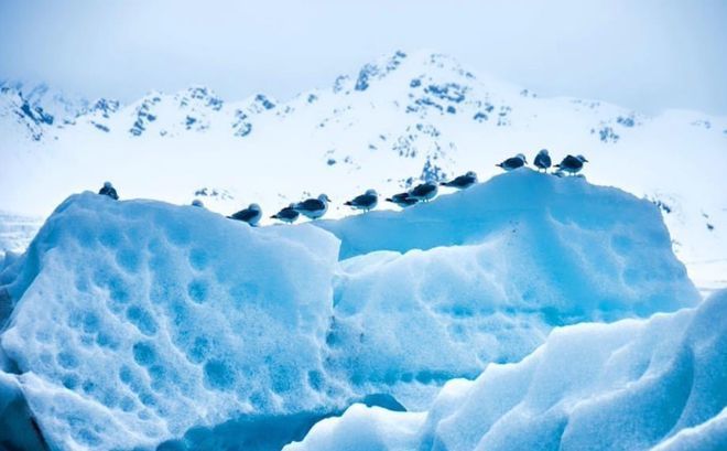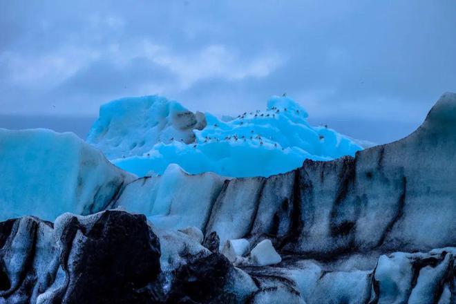 在冰上停留的小鸟排队站好,让北极有了生的灵动。