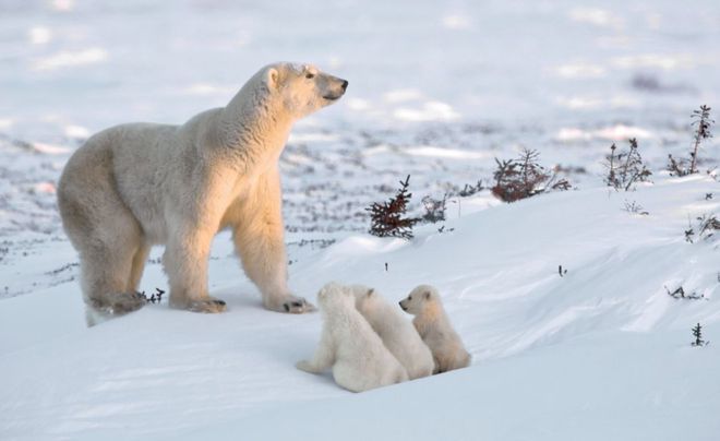因为没有东西吃,一头雄性北极熊从母熊那里把宝宝抢来吃掉