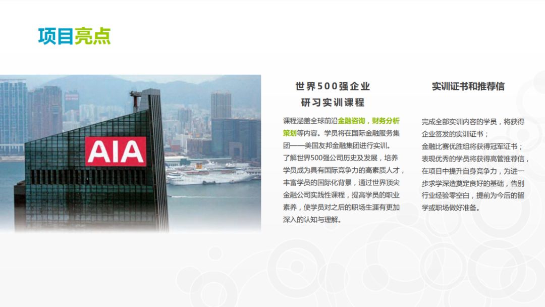 进入世界500强企业进行实训,与金融高管面对面交流,拓展人脉的同时也有机会拿到含金量很高的推荐信,为你的留学申请增添砝码。