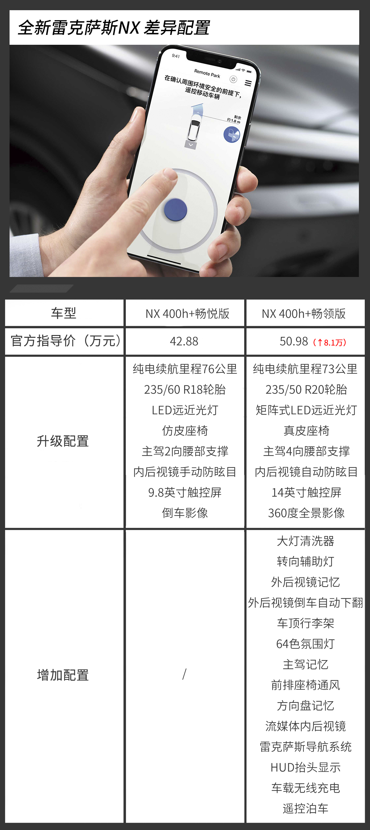 与NX 400h+畅悦版相比,NX 400h+畅领版的价格整整贵了8.1万元,这样的差价确实不算低,且它的售价已经接近51万元,这样的价格想必只能够成为极小部分人的选择。