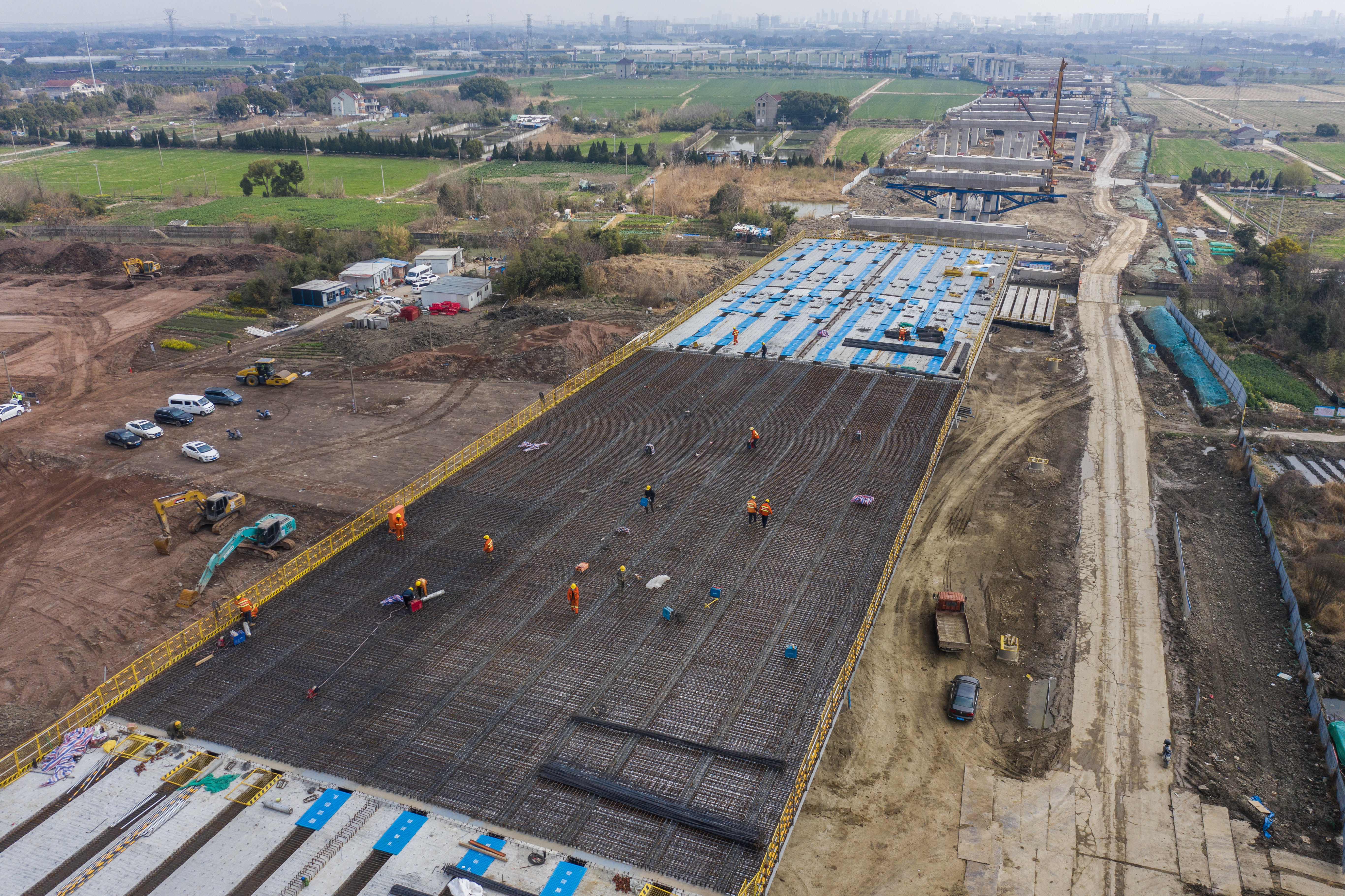 3月7日,在524国道秀洲王江泾至新塍公路工程TJ02标段,作业人员正在进行桥面施工作业(无人机照片)。新华社记者 徐昱 摄
