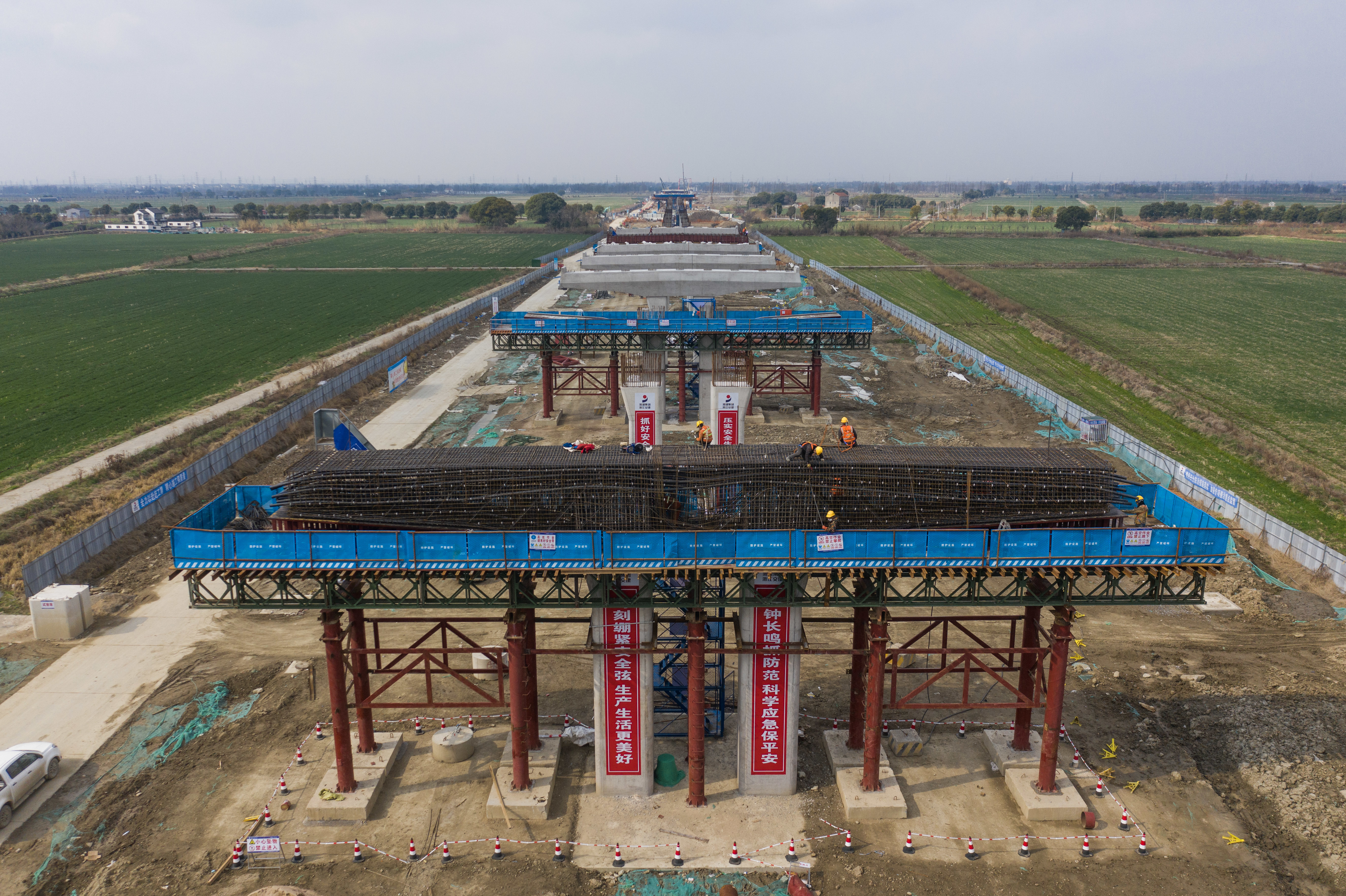 3月7日,在524国道秀洲王江泾至新塍公路工程TJ03标段,作业人员在桥墩上进行施工(无人机照片)。新华社记者 徐昱 摄