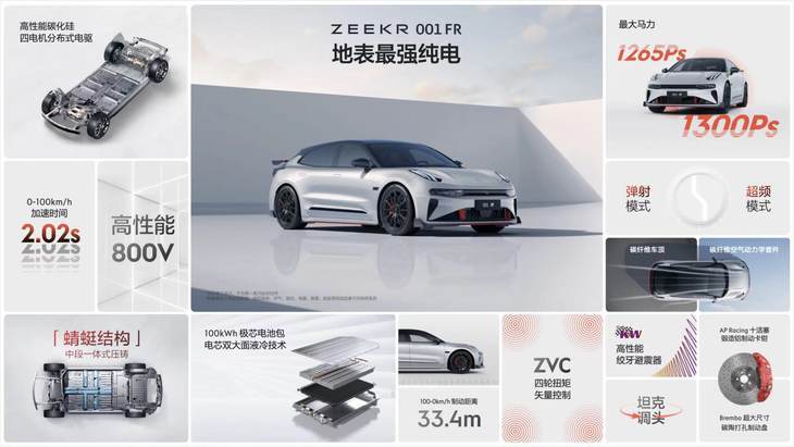 通讯方面,极氪001 FR将拥有卫星通信技术,这是全球首次量产上车,可以实现双向卫星消息,卫星语音通话。动力上,新车提供4电机,其中双电机版本0-100km/h加速仅需3.3秒,而四电机版本也是目前地表加速最快的电动车。新车还将配备PTM 2.0全域热管理系统,散热能力相当于约3匹家用空调制冷力,可在极限驾驶时帮助电池、电机系统冷却。